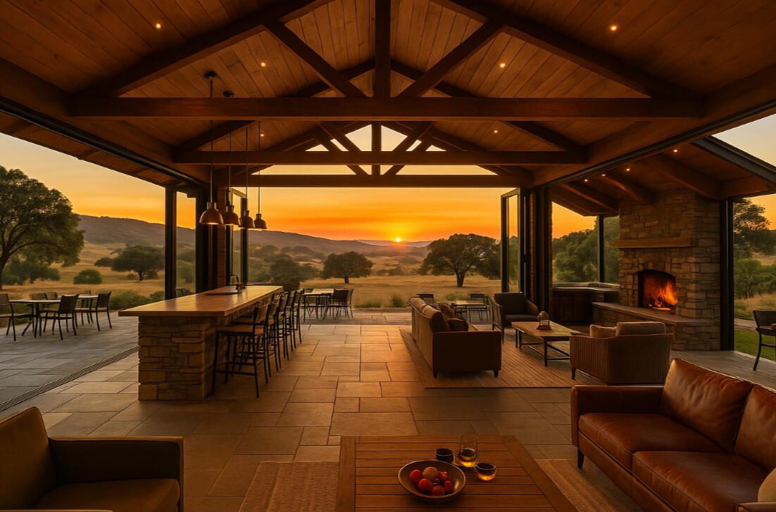 At the heart of The Refuge lies the Commons Restaurant & Lounge a warm, open-air sanctuary designed for connection, relaxation, and unforgettable moments. Framed by panoramic sunset views and surrounded by expansive hills covered in native vegetation, this elegant space brings guests together for everything from fireside chats to starlit dinners.Whether you’re sipping local brews at the on-site craft beer bar, enjoying a chef-prepared meal at one of our communal or private dining tables, or simply relaxing near the stone fireplace or sunken firepit, The Commons is where the spirit of The Refuge comes alive.With bar and lounge seating, casual and social dining zones, and a seamless indoor-outdoor layout, the Pavilion invites guests to slow down, savor, and reconnect—day or night.